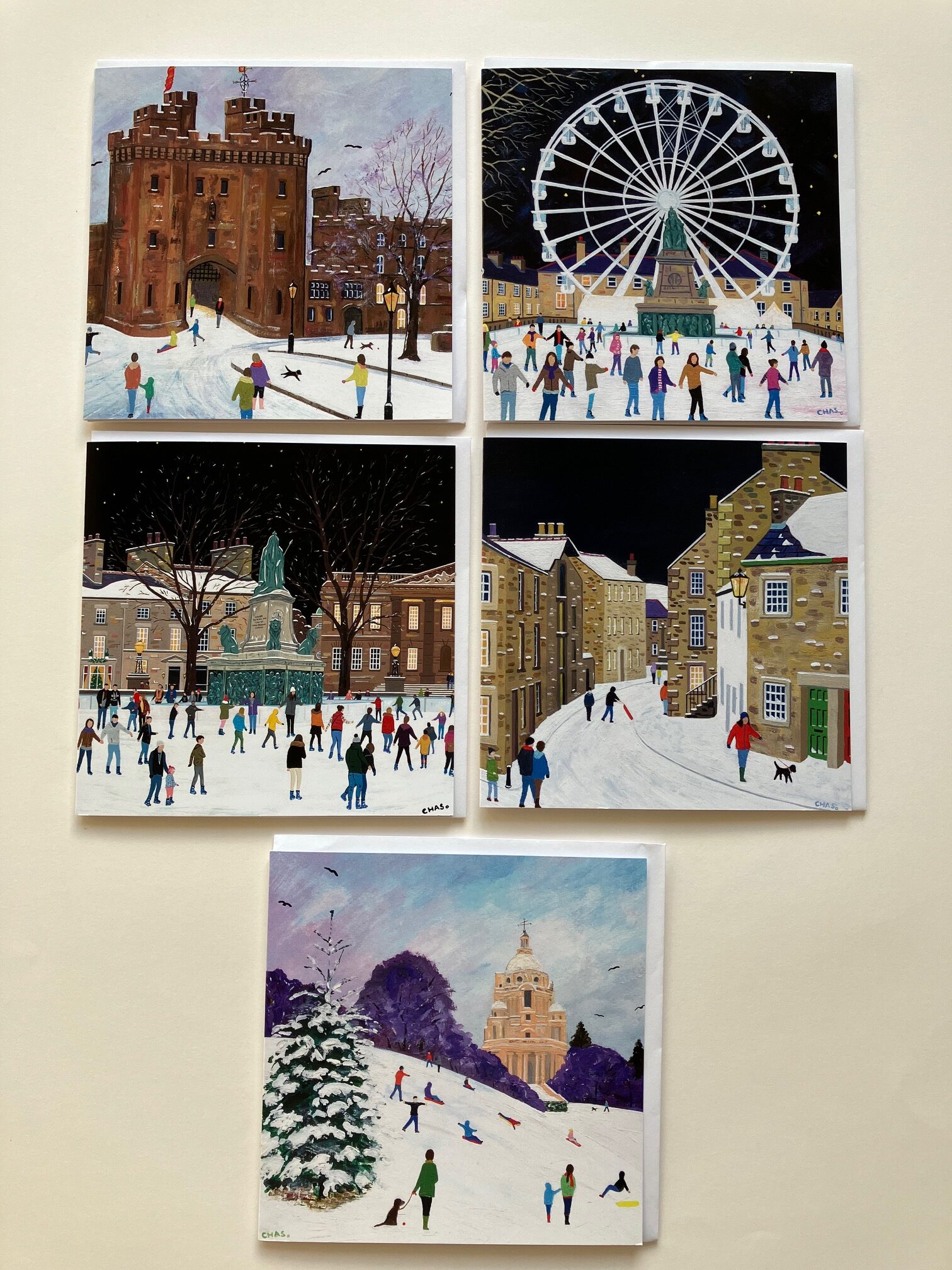 Titles of each card included in this set: ‘Castle in the Snow’, ‘Fun in the Snow’, ‘Lancaster on Ice’, ‘Winter on Castle Hill’ and ‘The Big Wheel at Lancaster on Ice’.