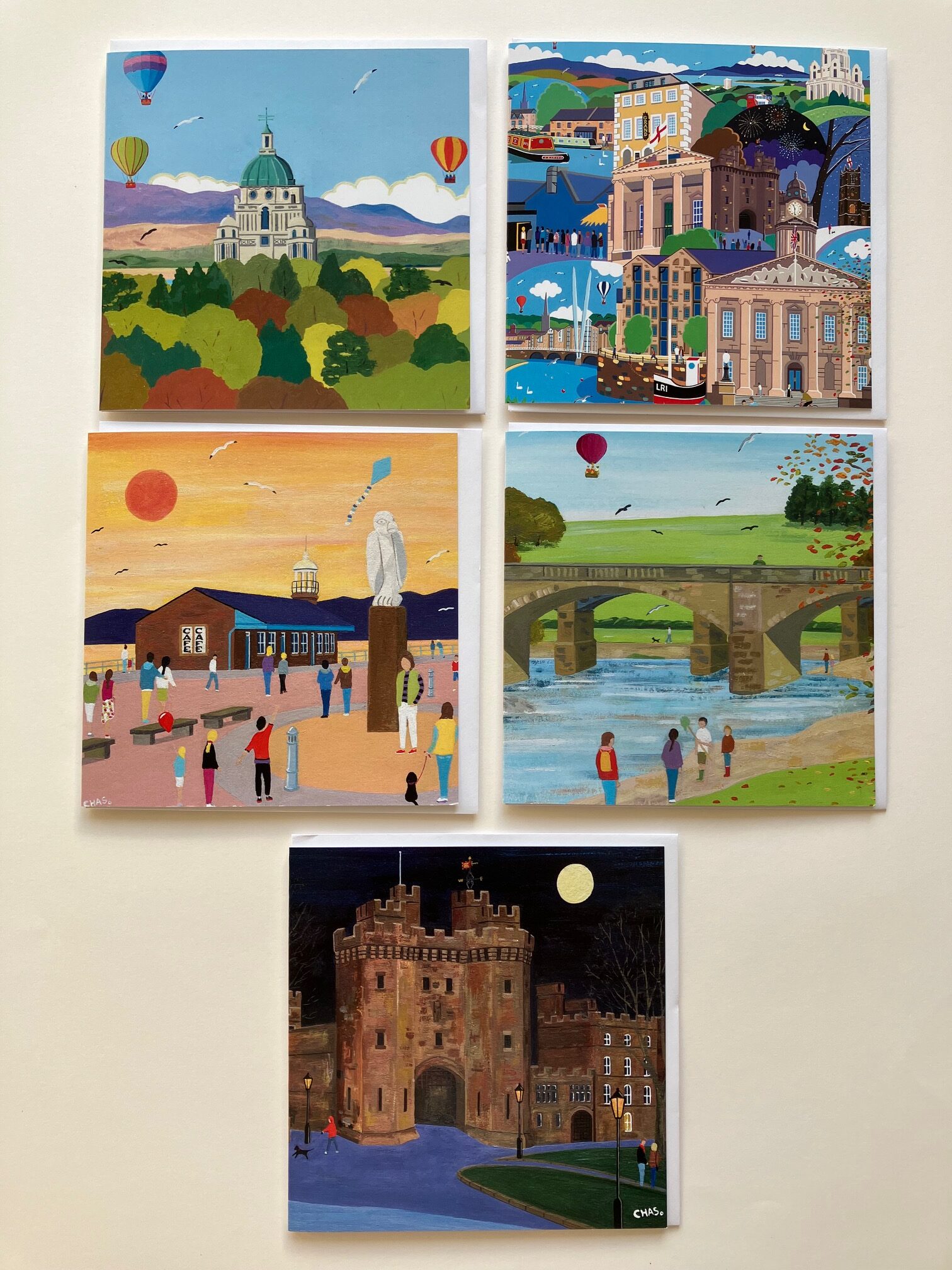 Titles of each card included in this set: ‘Up, Up & the Bay’, ‘Lancaster University City’, ‘Stone Jetty Cafe’, ‘Down at the Crook’ and ‘The Castle at Night’