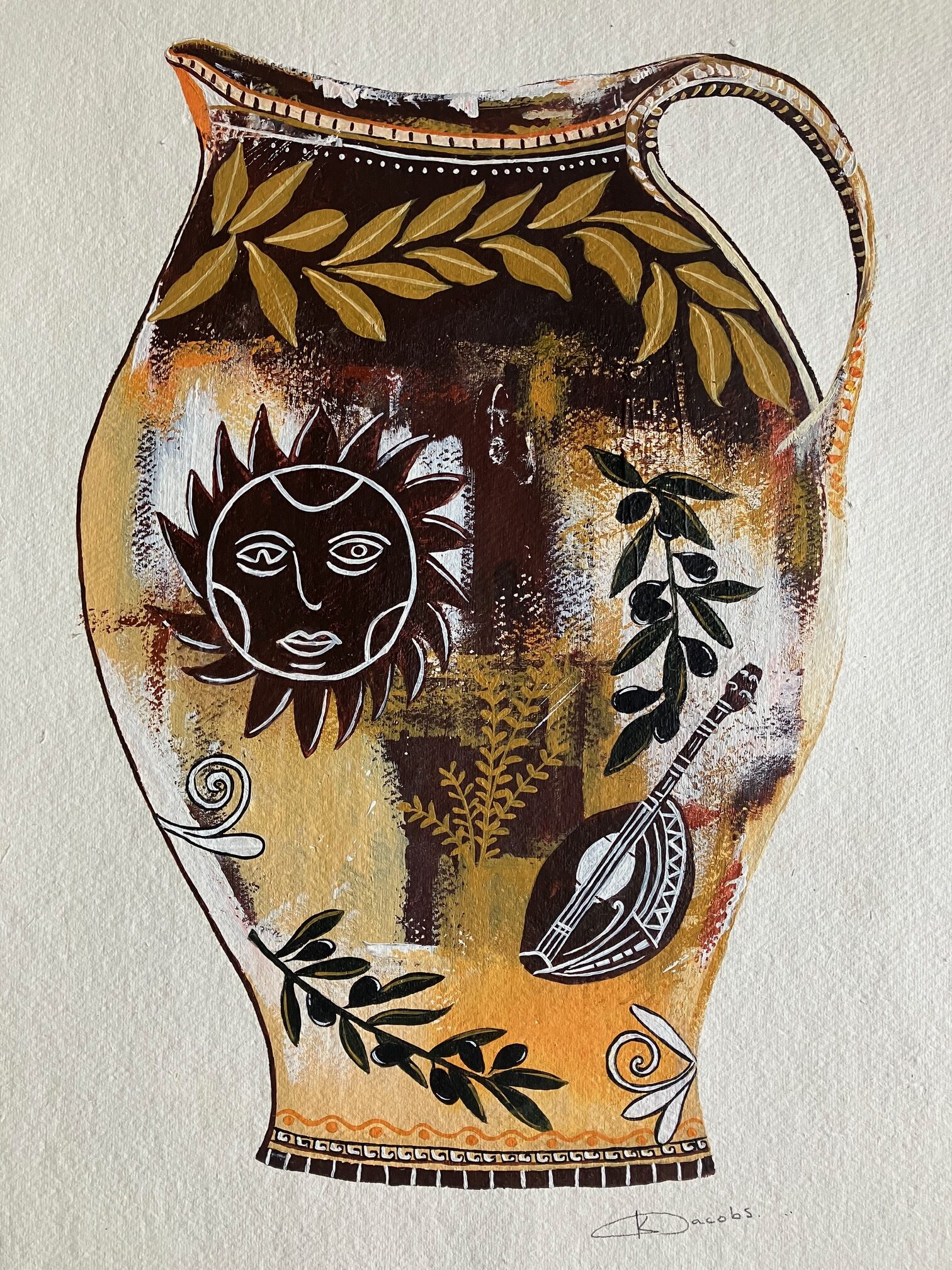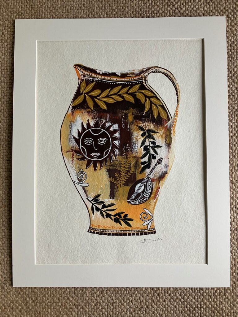 This is an original painting, in acrylic, on Saunders Waterford paper. I am fascinated by Greek Mythology and am occasionally inspired to create work connected to the Greek Gods and Goddesses, represented in a more contemporary way. Drawing inspiration from ancient Greek vases, this painting features Apollo, twin of Artemis and son of Greek God Zeus. Apollo was the God of many things including music, sun, light, art, poetry, medicine and knowledge. Known for delighting Olympus with tunes played on his golden lyre (a small harp) he was also the God of light and served as an intermediary between the Gods and men. The laurel, used in Greece as a status symbol, was Apollo’s tree.