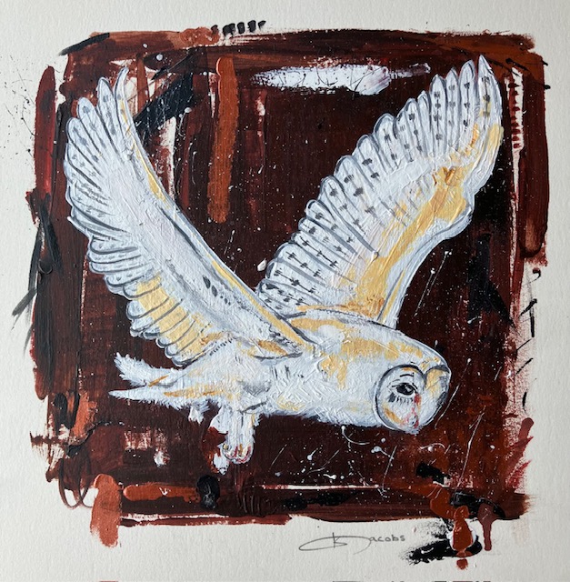 This is an original painting, in acrylic, on Saunders Waterford paper. Inspired by the Barn Owl I saw frequently during February 2025, hunting during the day in the surrounding fields – a beautiful sight!