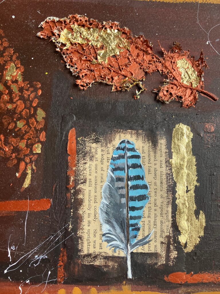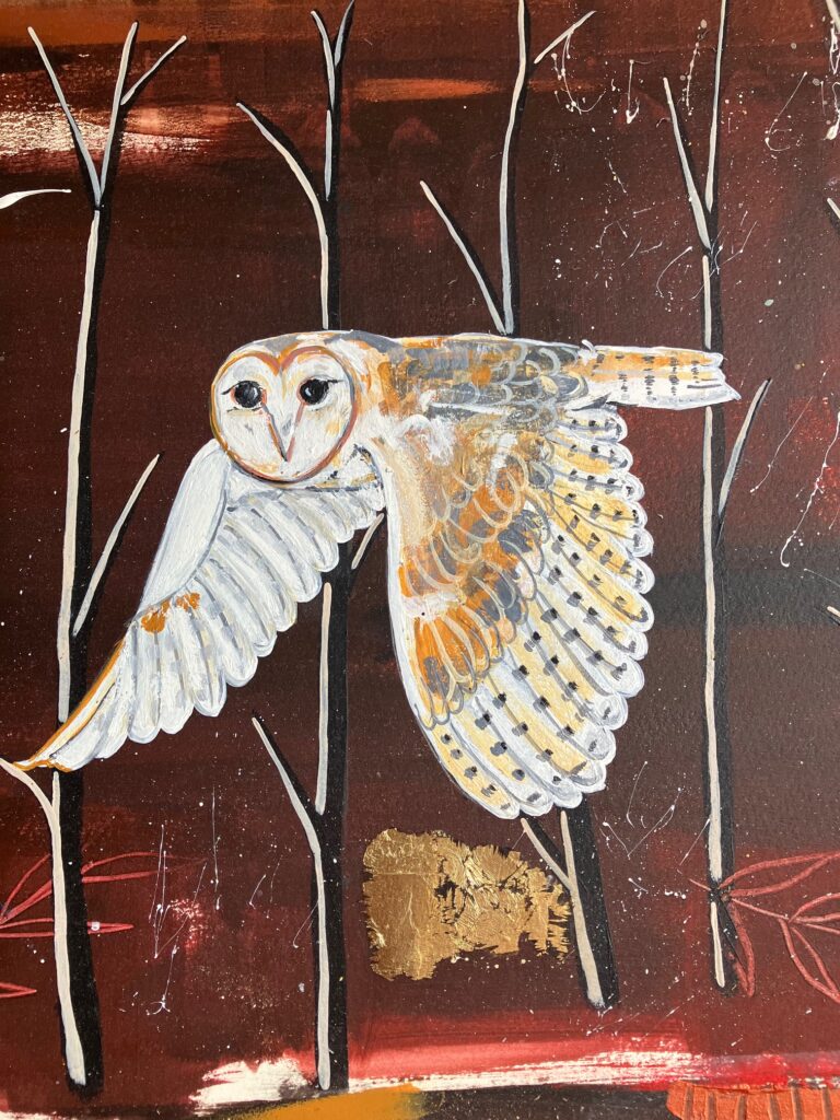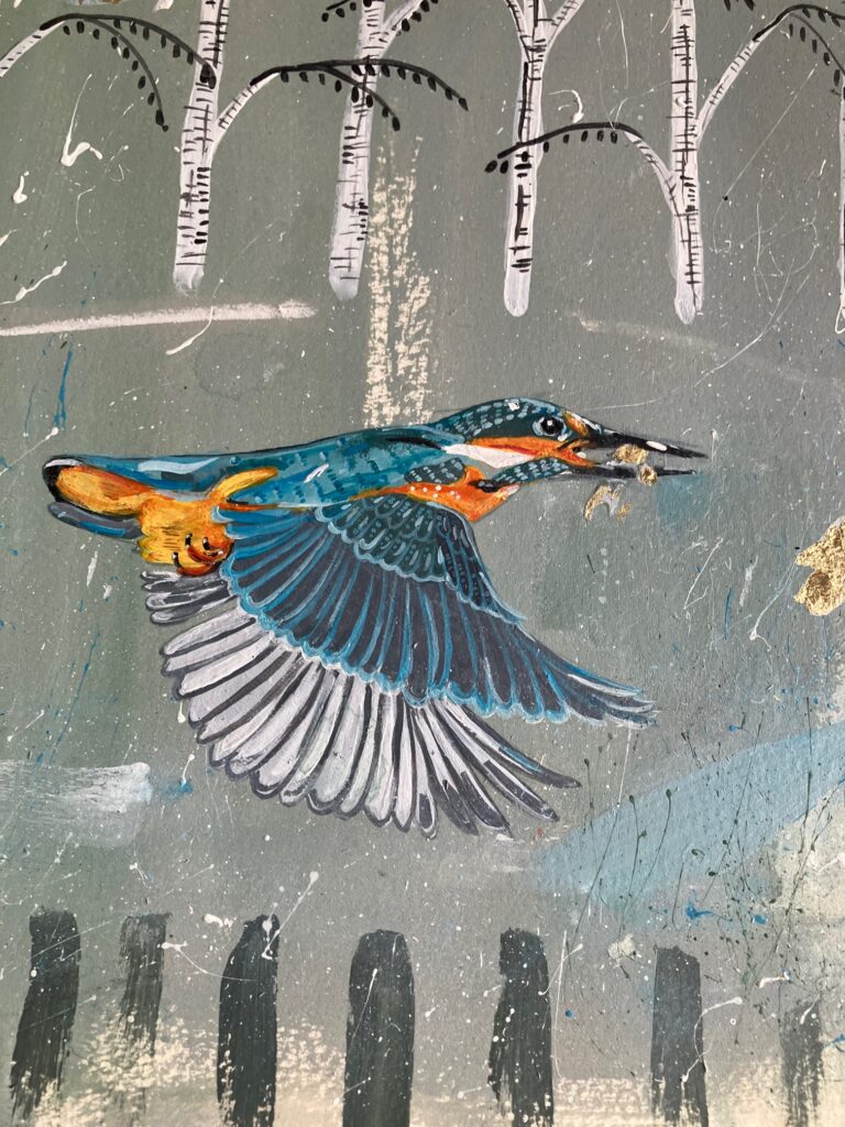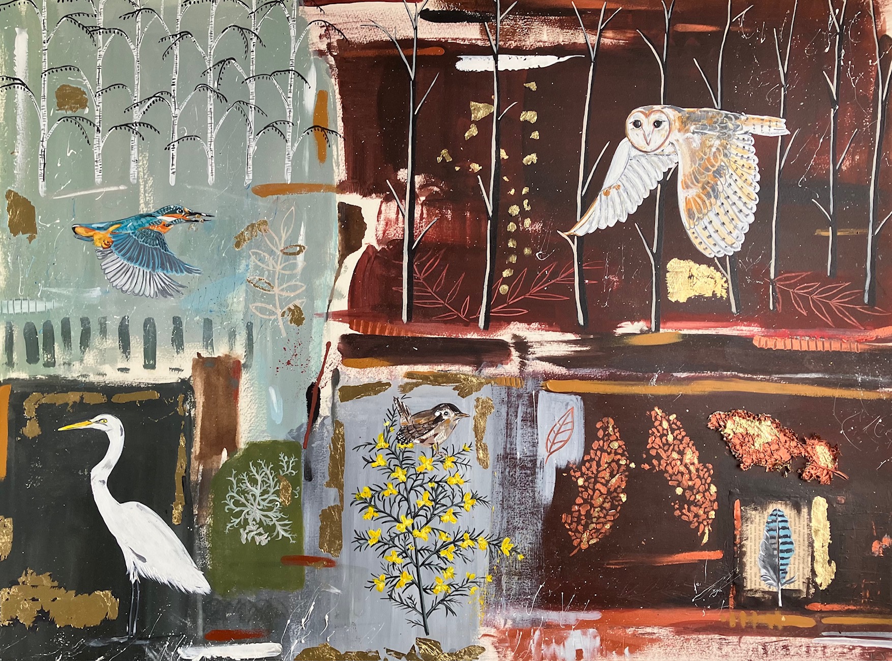 This painting is completely inspired by my weekly walks to Roeburndale and the ancient woodland in the valley, following the river. Featuring kingfisher, barn owl, little egret and wren, flora such as gorse and lichen, the painting includes leaf skeletons, gold leaf and natural pigments from slate mines in Cumbria in addition to acrylic. This is a large painting and if you would prefer to collect from me rather than sending out with recorded delivery, please get in touch. I can also have the painting framed if you wish and we can ship this anywhere in the UK for a shipping charge.
