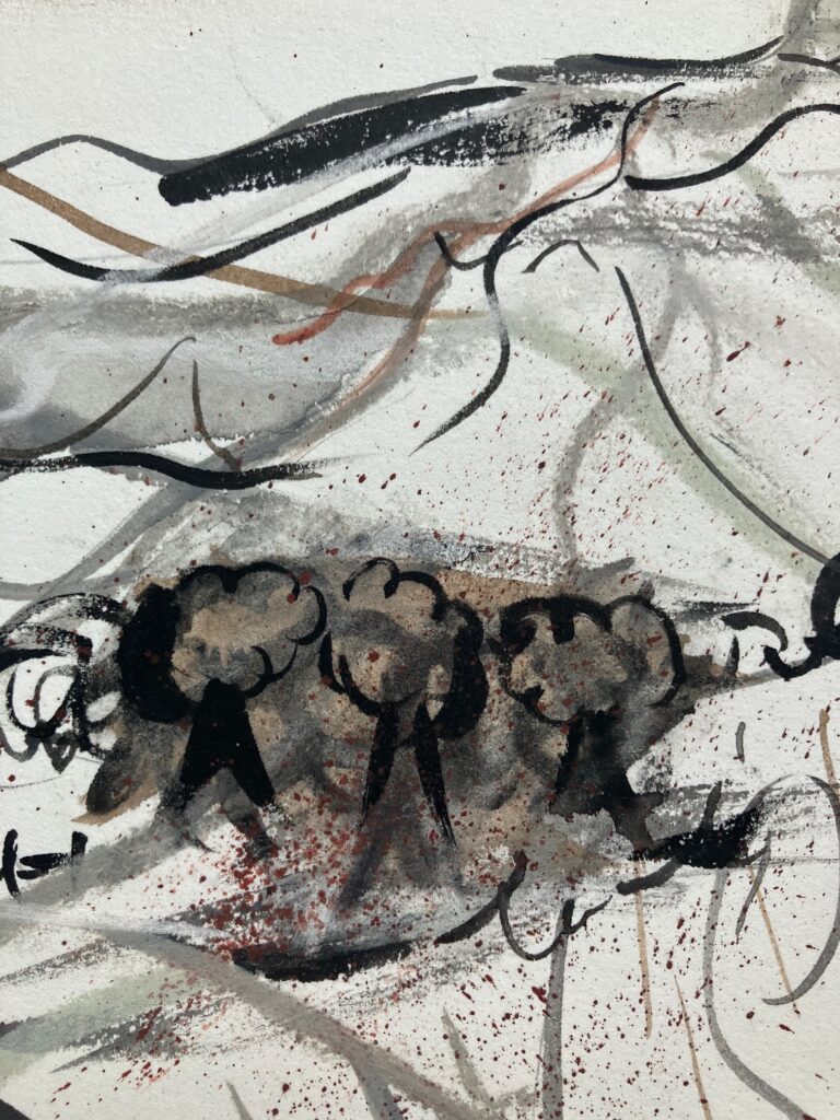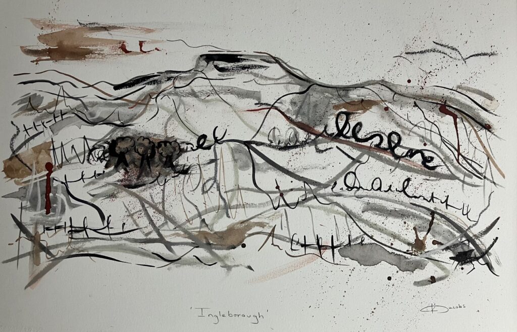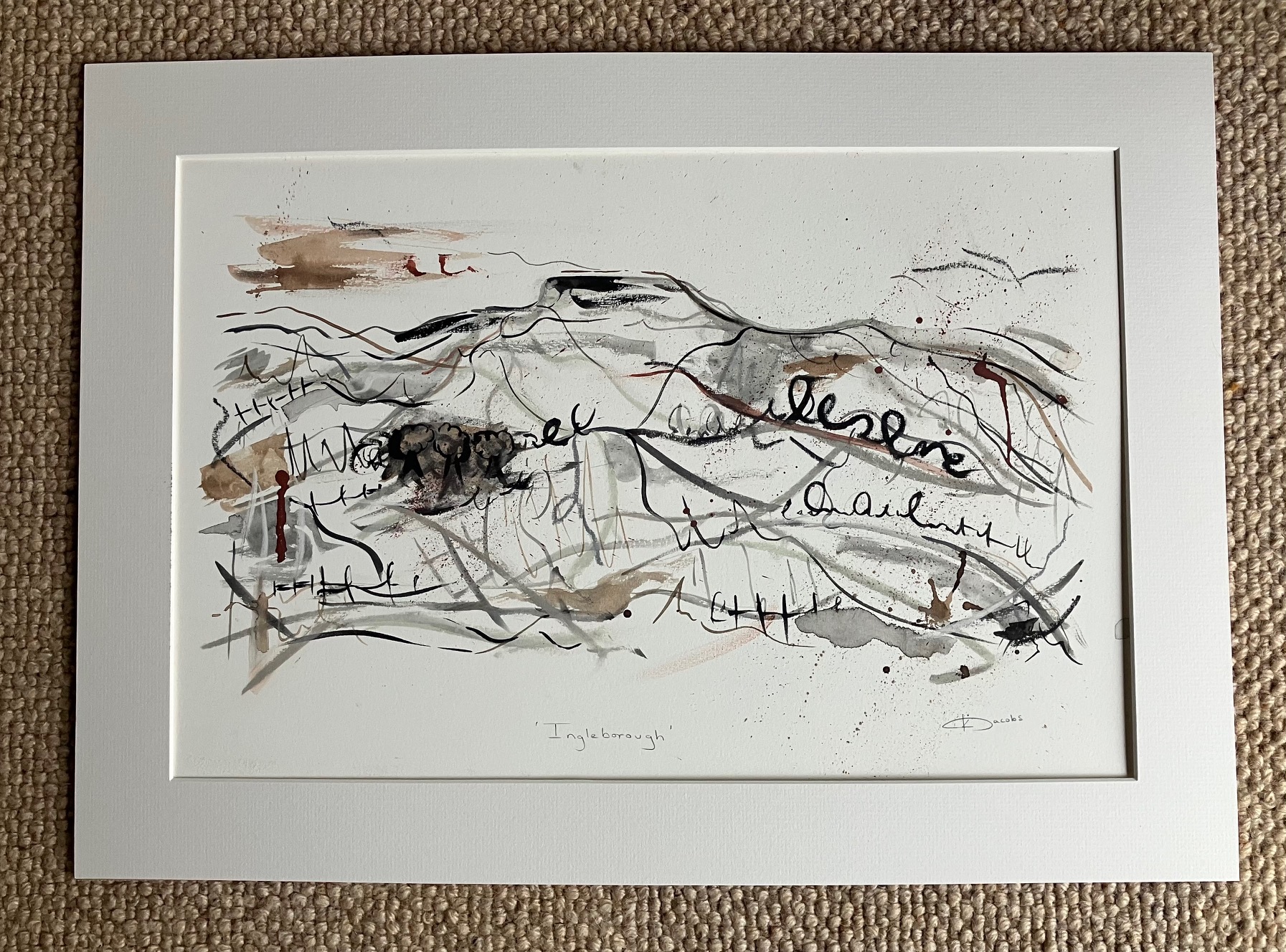 This is an original painting, in acrylic, on Saunders Waterford paper. Using a style of ‘line’ drawing and muted colours to represent the landscape of Ingleborough on a wet autumn/winter day!