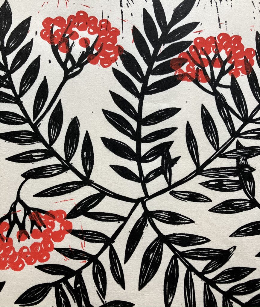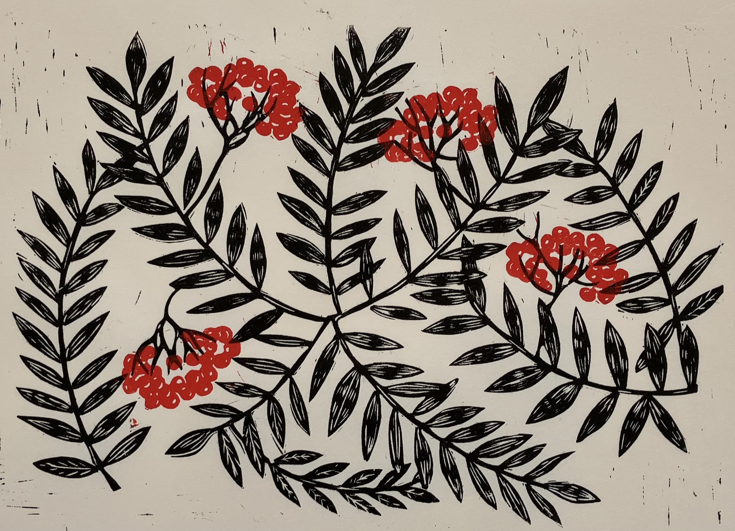 Rowan Berries print in a lovely Ivory Black & Vermillion red ink, hand carved linocut and hand printed onto a warm white Japanese Awagami Select 60 g paper.
