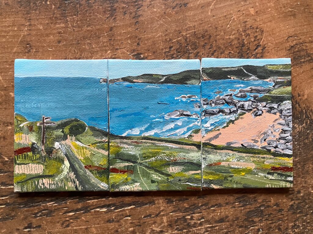 A very, very small painting on 3 canvas boards of one of my favourite beaches in South Devon called Mattiscombe, just off the South West Coast Path and not far from Start Point Lighthouse. Would look very nice in a photo frame, maybe one from Nkuku! (www.nkuku.com)