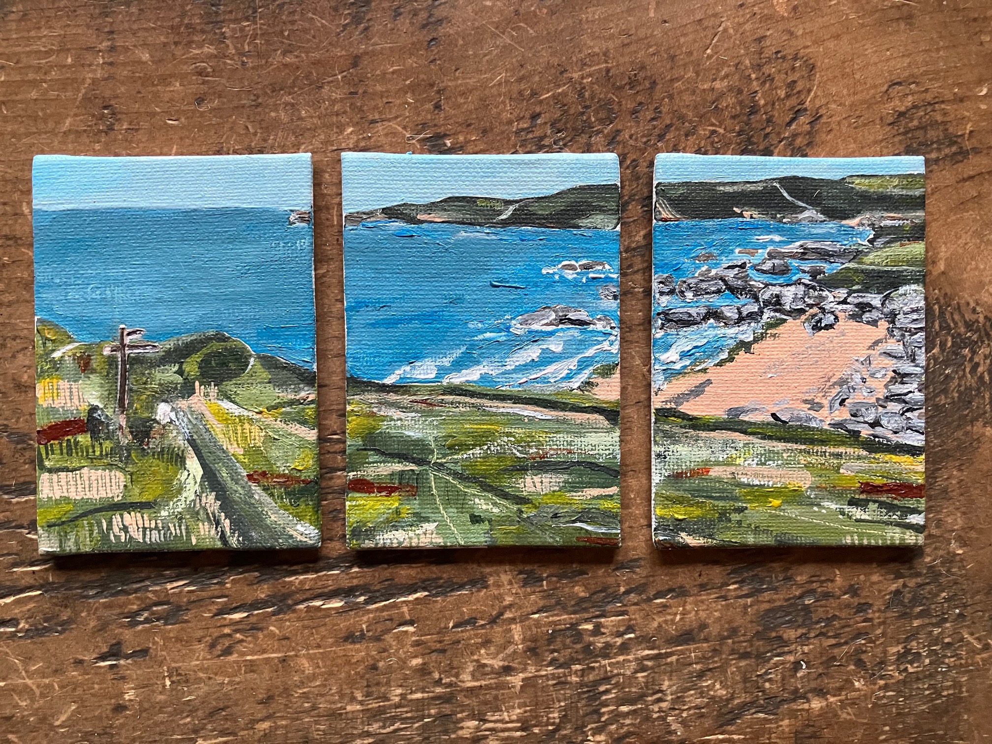 An original miniature triptych painting in acrylic on tiny canvas boards.