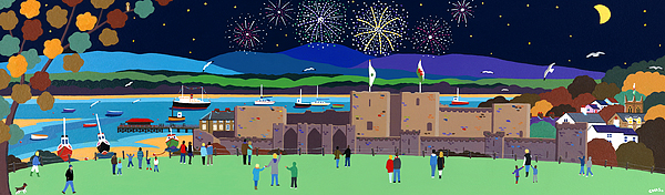 Beaumaris Castle on the island of Angelsey in Wales. It was built as one of the ‘iron ring’ of North Wales castles by the English monarch Edward I. Work began in 1295, but it was never finished. Money and supplies run out before the fortifications reached their full height. It’s still a magnificent sight though. This print depicts Bonfire Night and the firework display overlooking the Menai Strait.
