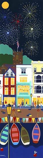 A partial view of the ‘Boat Float’ inner harbour in Dartmouth, with St Saviour’s Church, dating from 1372, in the background. Fireworks explode overhead during the famous annual Dartmouth Regatta, which first began in 1822 and became a Royal Regatta in 1856 when Queen Victoria and Prince Albert came into Dartmouth on a flotilla of 9 boats. That night there were special illuminations both ashore and afloat. The Queen donated £25 for 3 rowing races to be competed for by the sailors of Dartmouth. The Queen sailed to Plymouth the following day, but before leaving, bestowed the title of ‘Royal’ to the Regatta. Today it’s a a fun packed weekend of sailing, gig boat racing, live music and fireworks!