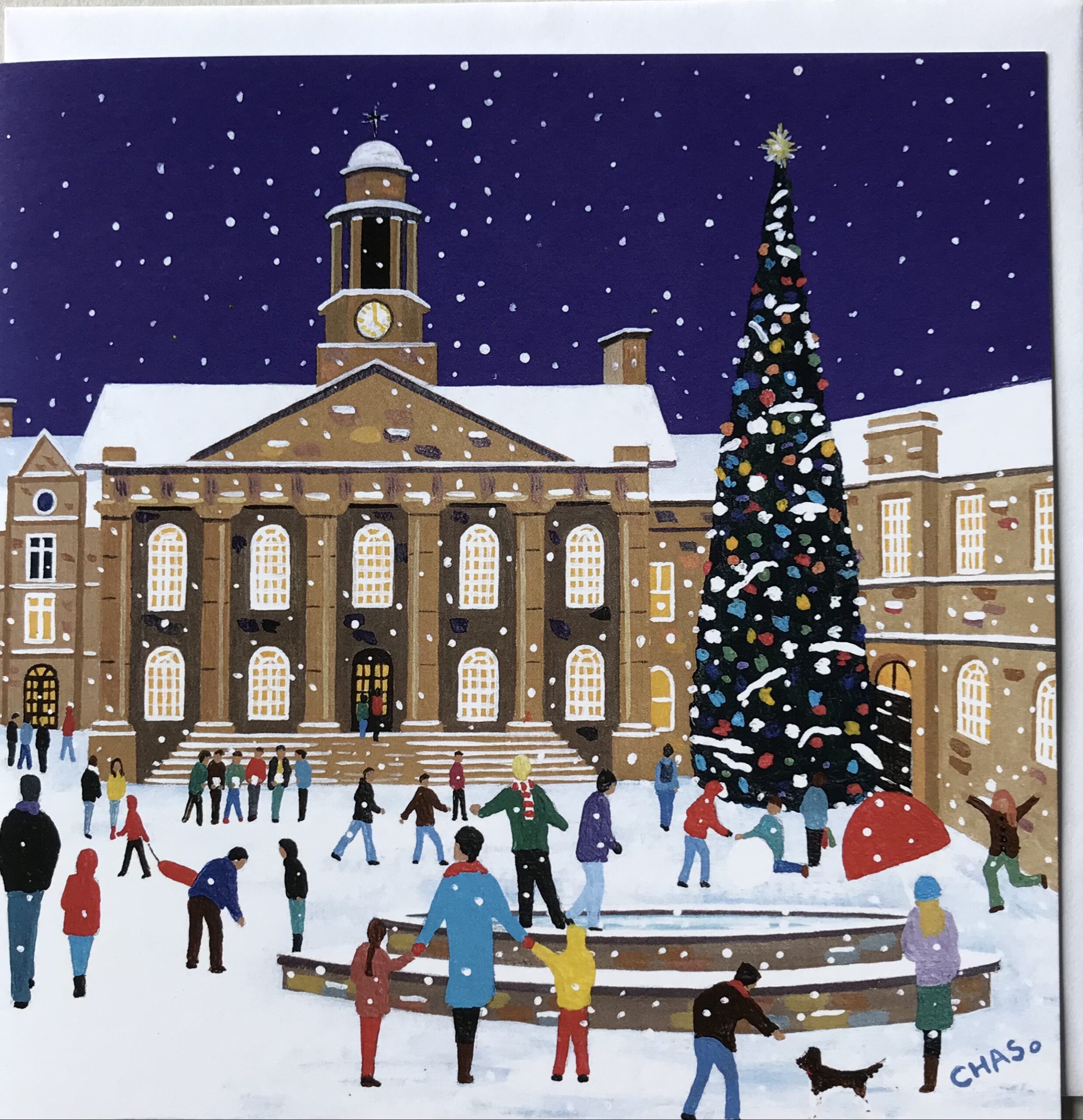 A quality giclée print. All prints are on Somerset Velvet fine art paper, hand signed by the artist. Taken from an original painting in acrylic, a Christmas scene of Market Square in Lancaster as it was in the 1990’s, busy with shoppers in front of the beautiful Christmas trees at the entrance of Lancaster Museum.