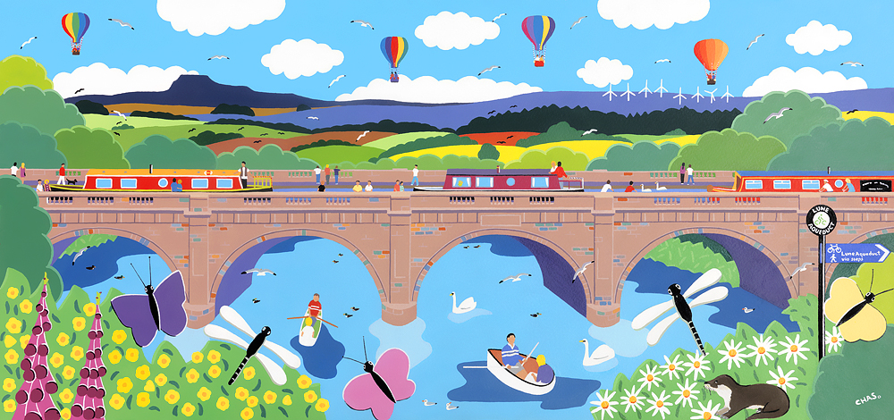 Colourful narrowboats on the Lune Aqueduct, with Ingleborough in the background.