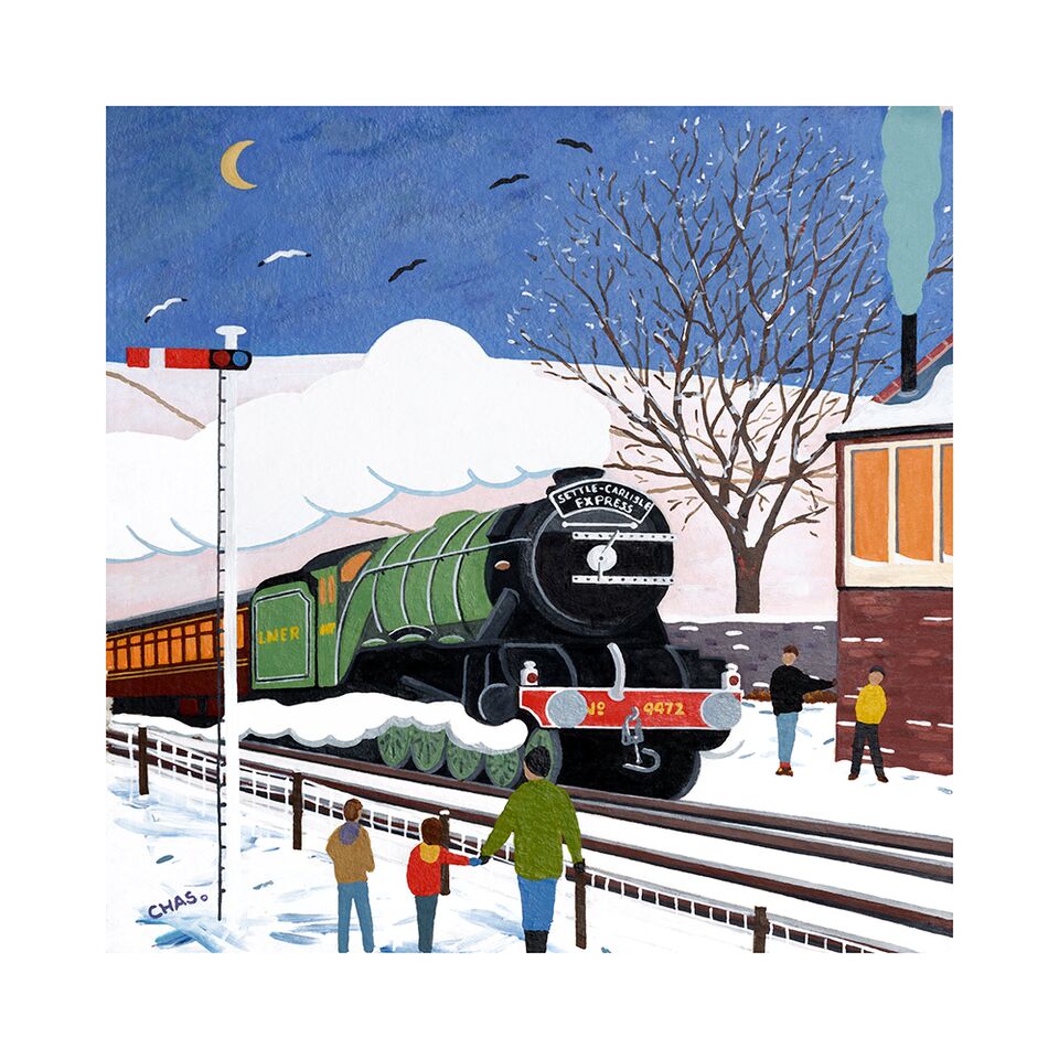 A quality giclée print. All prints are on Somerset Velvet fine art paper, hand signed by the artist. Taken from an original painting in acrylic, a winter scene of the beautiful Flying Scotsman steam train.