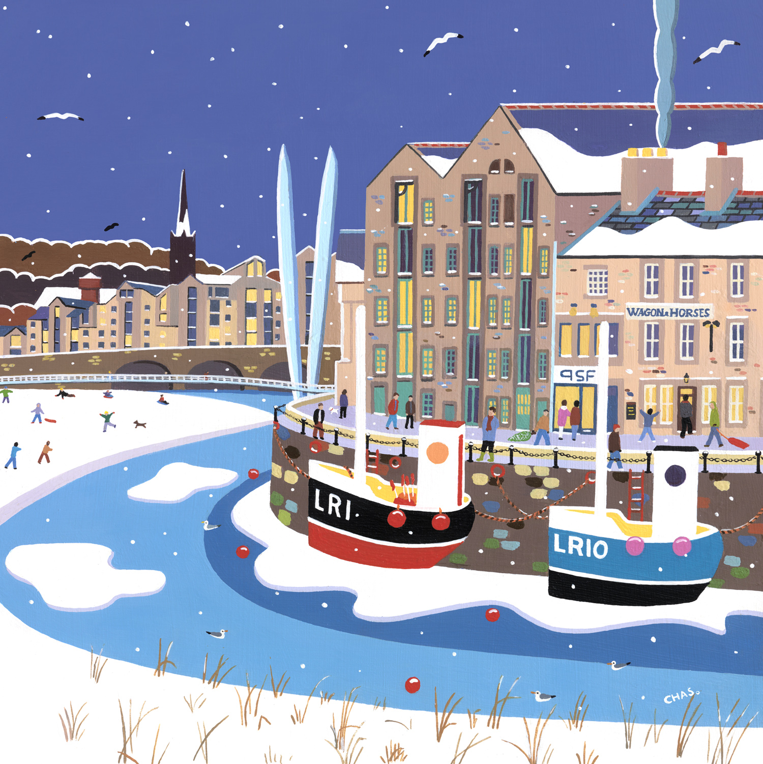 A quality giclée print. All prints are on Somerset Velvet fine art paper, hand signed by the artist. Taken from an original painting in acrylic, a winter scene of St George’s Quay in Lancaster.